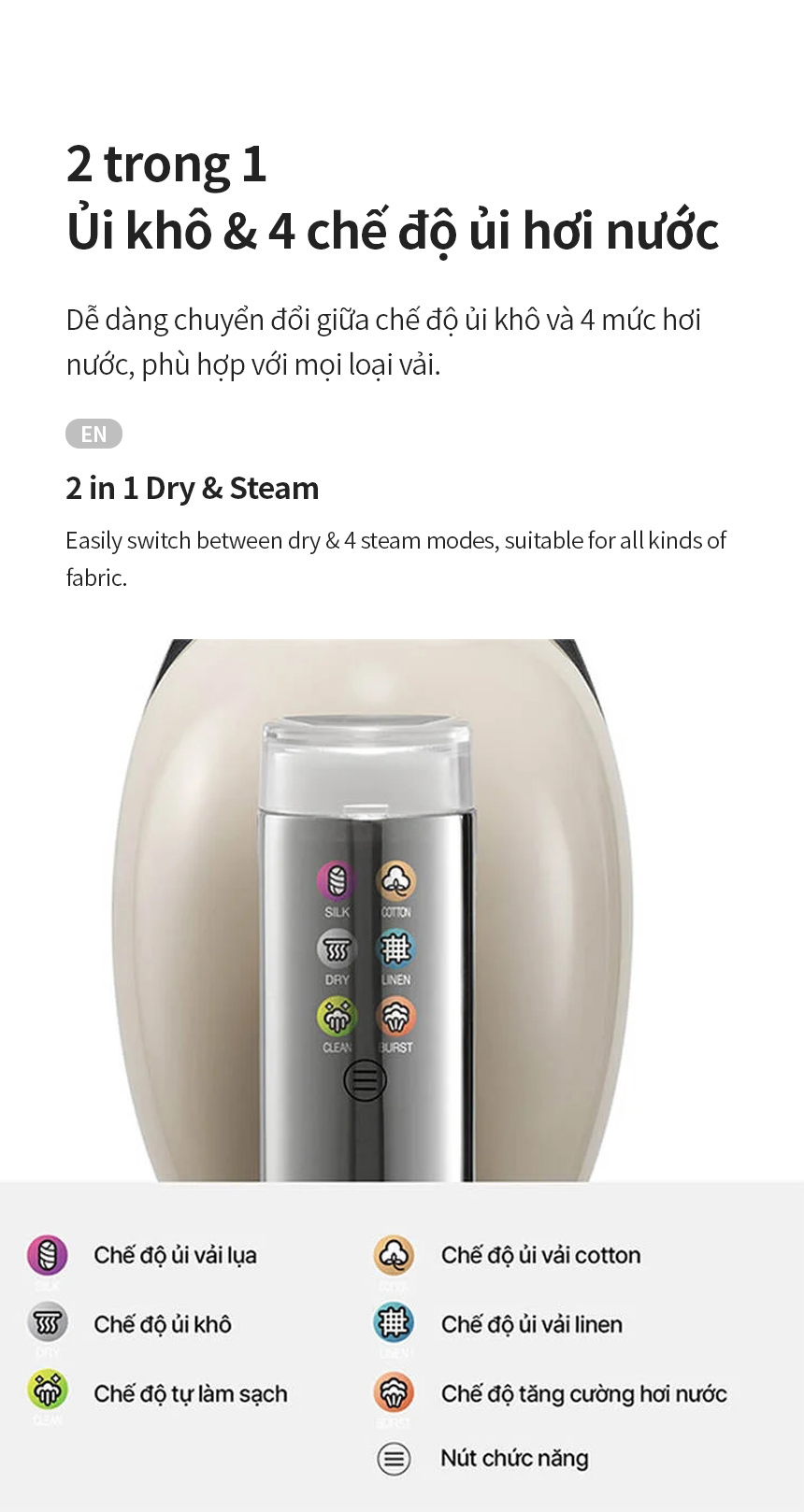 ỦI KHÔ & 4 CHẾ ĐỘ ỦI HƠI NƯỚC: Dễ dàng chuyển đổi giữa các chế độ, phù hợp với mọi loại vải