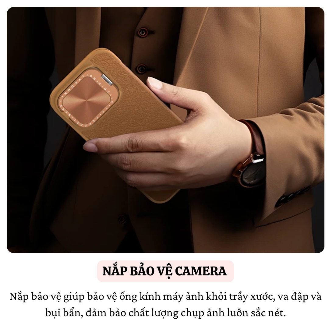 - Thiết kế mở/đóng linh hoạt giúp bạn dễ dàng vệ sinh camera, giữ cho ống kính luôn sạch sẽ và bảo vệ chất lượng hình ảnh gốc. Mặt lưng bao da cao hơn so với camera, giúp bảo vệ ống kính khỏi mài mòn.