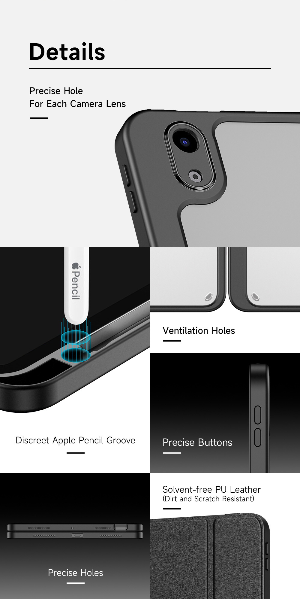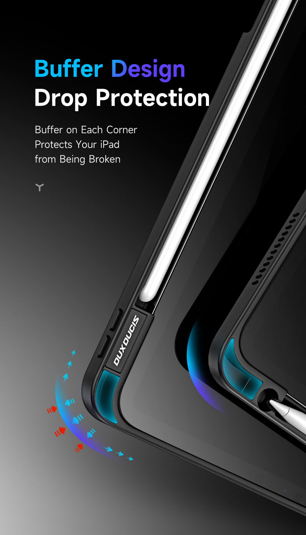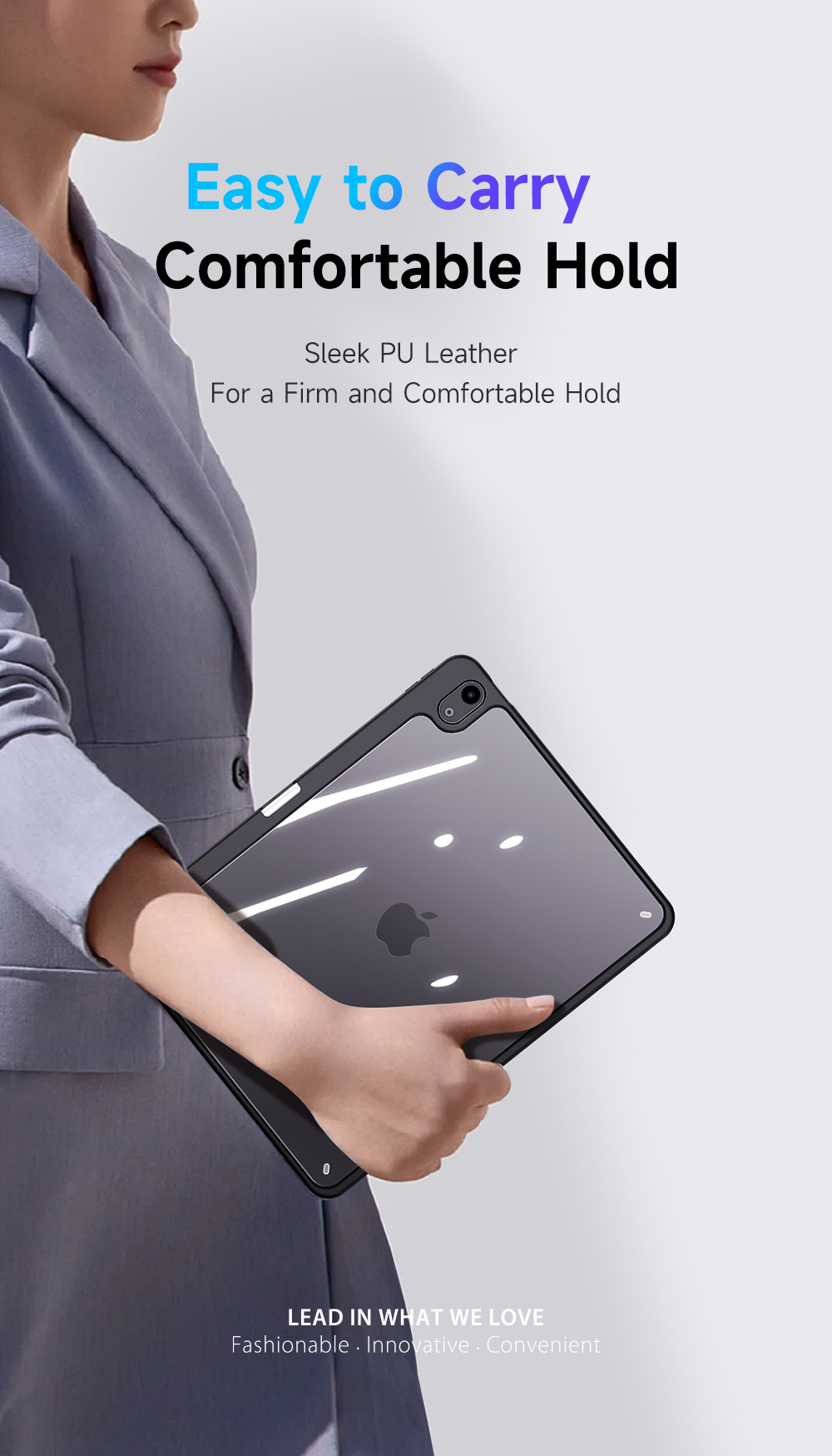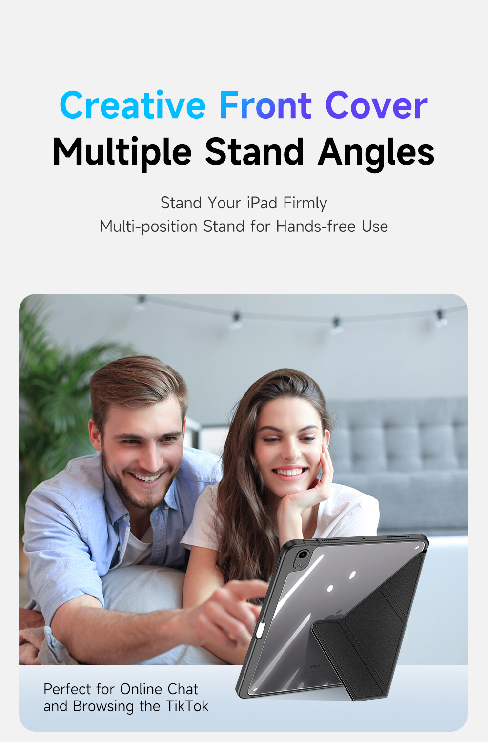 Mặt trước sáng tạo cung cấp nhiều góc đứng giúp bạn rảnh tay khi xem, duyệt trên máy tính bảng. Nắp sau trong suốt có thể được tháo rời khỏi nắp trước và sử dụng độc lập, rất phù hợp để chơi trò chơi trên máy tính bảng.