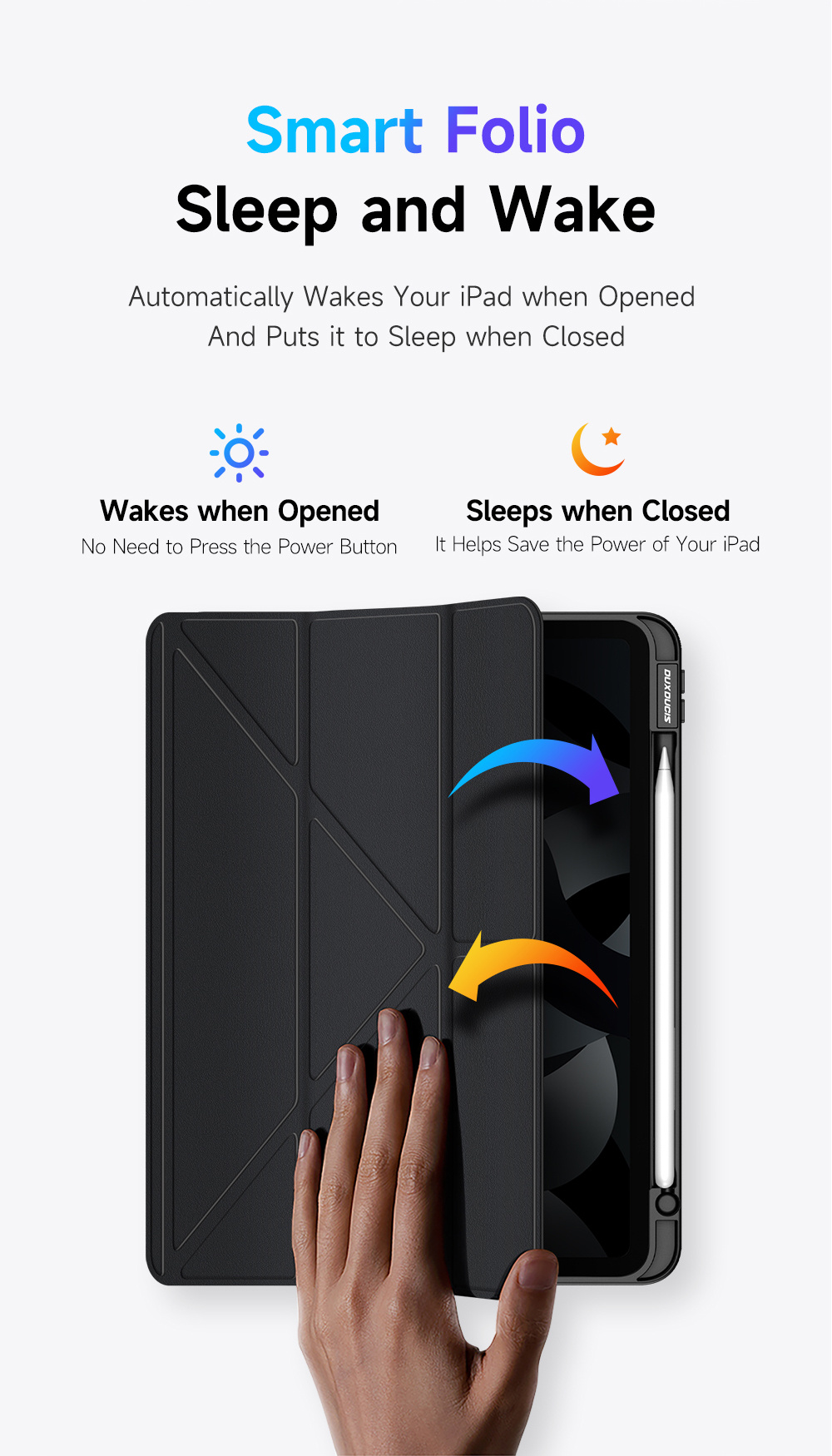 Smart folio cung cấp chức năng đánh thức/ngủ, nó tự động đánh thức máy tính bảng của bạn khi mở và đặt nó ở chế độ ngủ khi đóng.