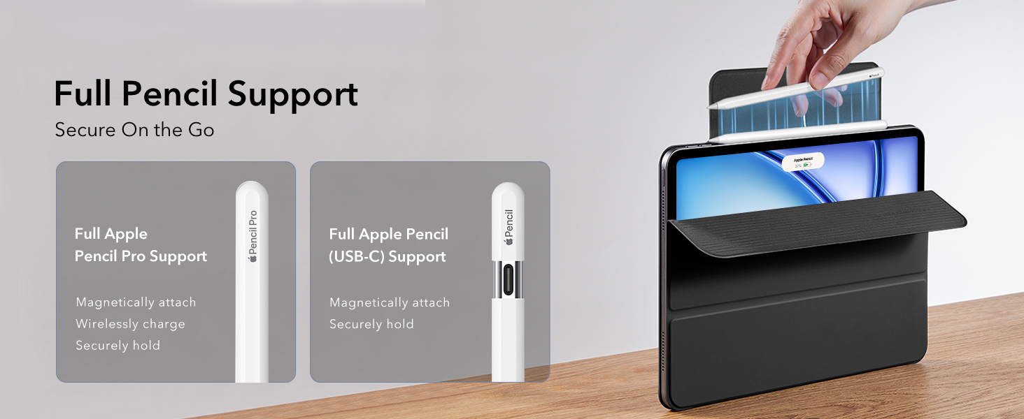 Vỏ iPad này hỗ trợ đầy đủ Pencil Pro và Pencil (USB-C) với rãnh bên lõm để sạc từ tính và kẹp từ tính để giữ bút chì của bạn an toàn