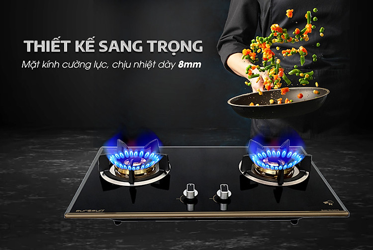 được trang bị mặt kính cường lực cỡ lớn, chịu nhiệt cao với kích thước lên đến 760*440mm dày 8mm, vát 4 cạnh. Đây là loại bếp ga được trang bị mặt kính lớn nhất hiện nay tạo thêm phần sang trọng cho không gian bếp.