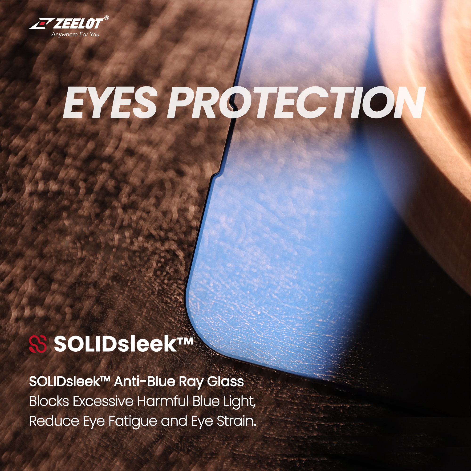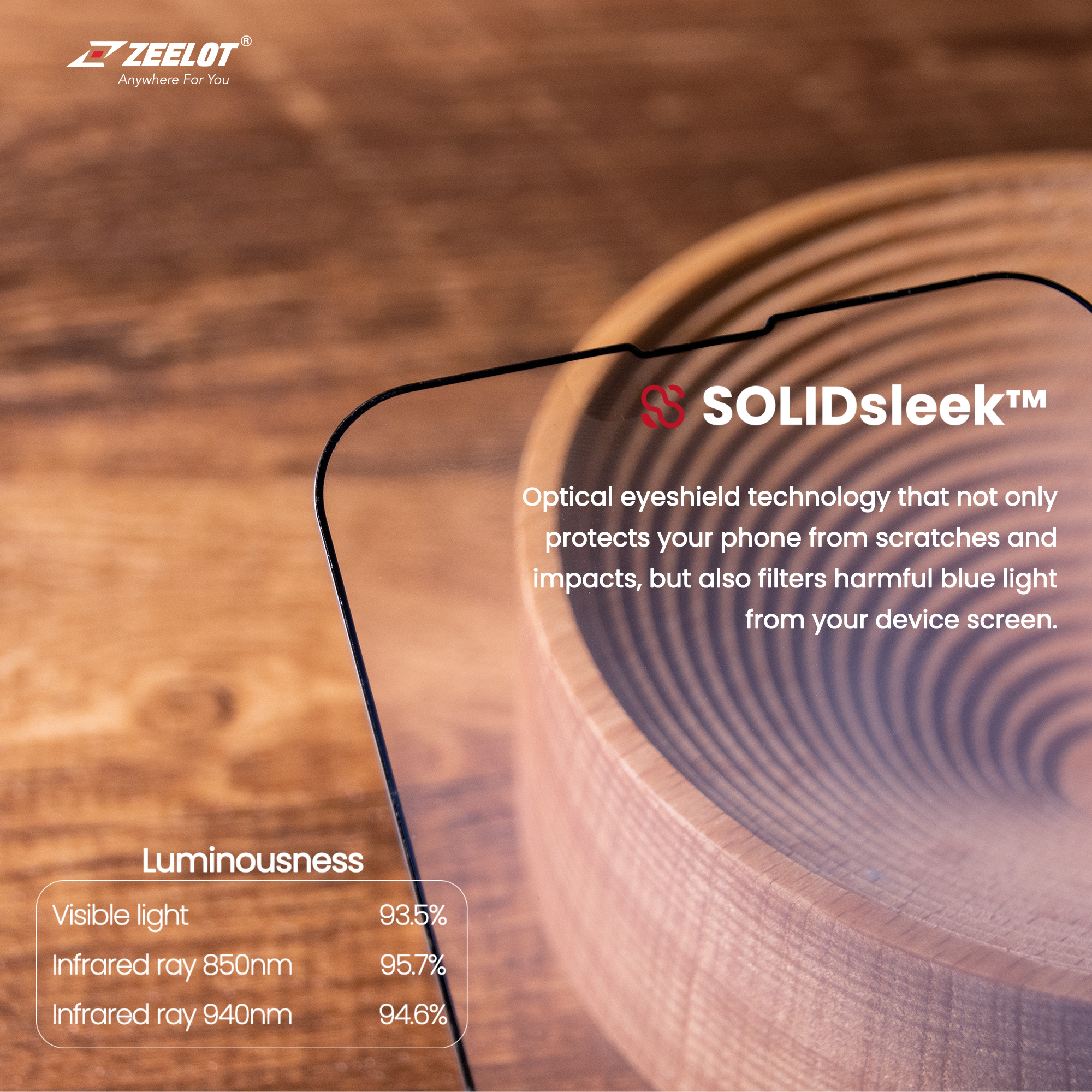 SOLIDsleek chống ánh sáng xanh Glass - Bảo vệ sức khỏe đôi mắt gia đình bạn. Zeelot đã phát triển một công nghệ tấm chắn tia xanh quang học bảo vệ mắt mới nhất thị trường. Với công nghệ này, tấm kính cường lực không chỉ bảo vệ chiếc smartphone, mà còn ngăn ngừa các tác hại về mắt cho người tiêu dùng.