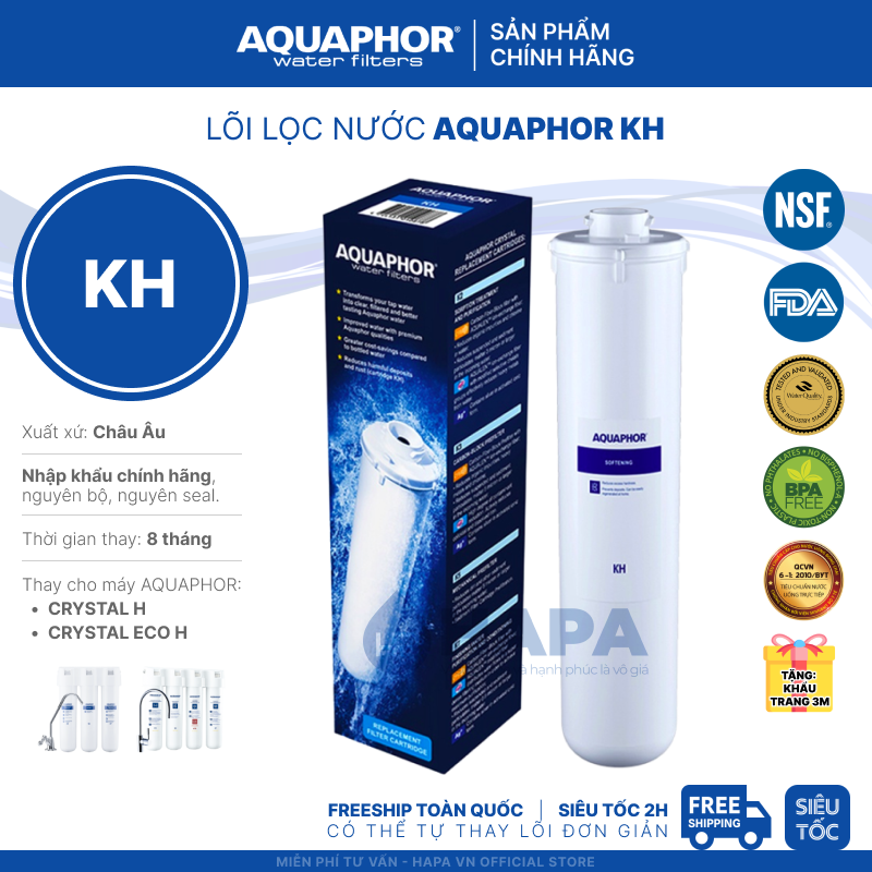 - AQUAPHOR KH được sử dụng với máy lọc nước uống tinh khiết Aquaphor Crystal. Tuổi thọ của lõi lọc phụ thuộc vào độ cứng của nước và có thể tái tạo.