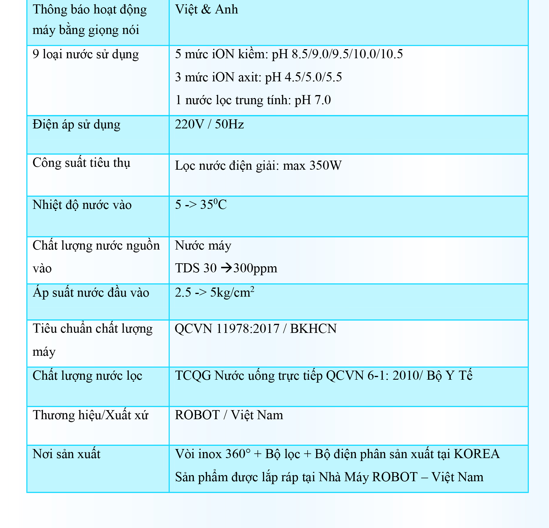 - Với mong muốn nhiều gia đình Việt có thể sử dụng nước điện giải iON kiềm với chi phí hợp lý để bảo vệ sức khỏe, sắc đẹp & nâng cao chất lượng cuộc sống, ROBOT mang đến sản phẩm “Chất lượng Quốc tế - Giá thành Việt Nam”, phù hợp với mức sống của nhiều người. Tiết kiệm cho người tiêu dùng đến hơn một nửa chí phí so với máy nhập khẩu chỉ từ 30 – 50%, nhưng sở hữu nhiều ưu điểm, tính năng vượt trội, chất lượng cao.