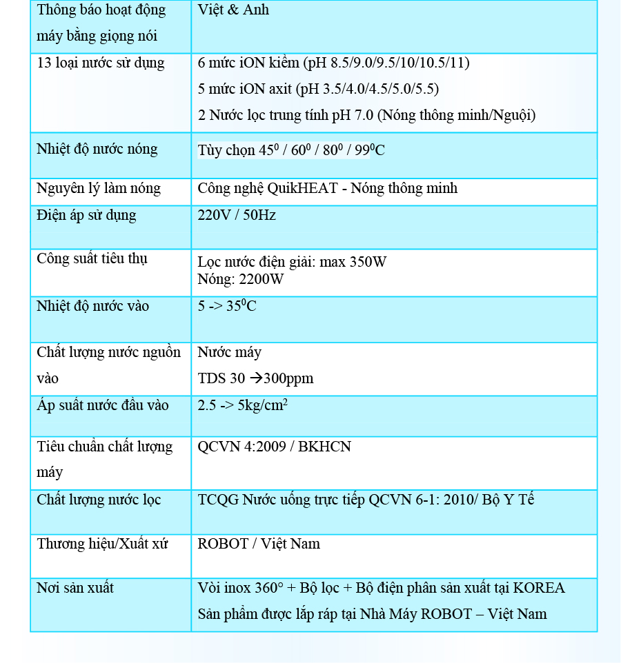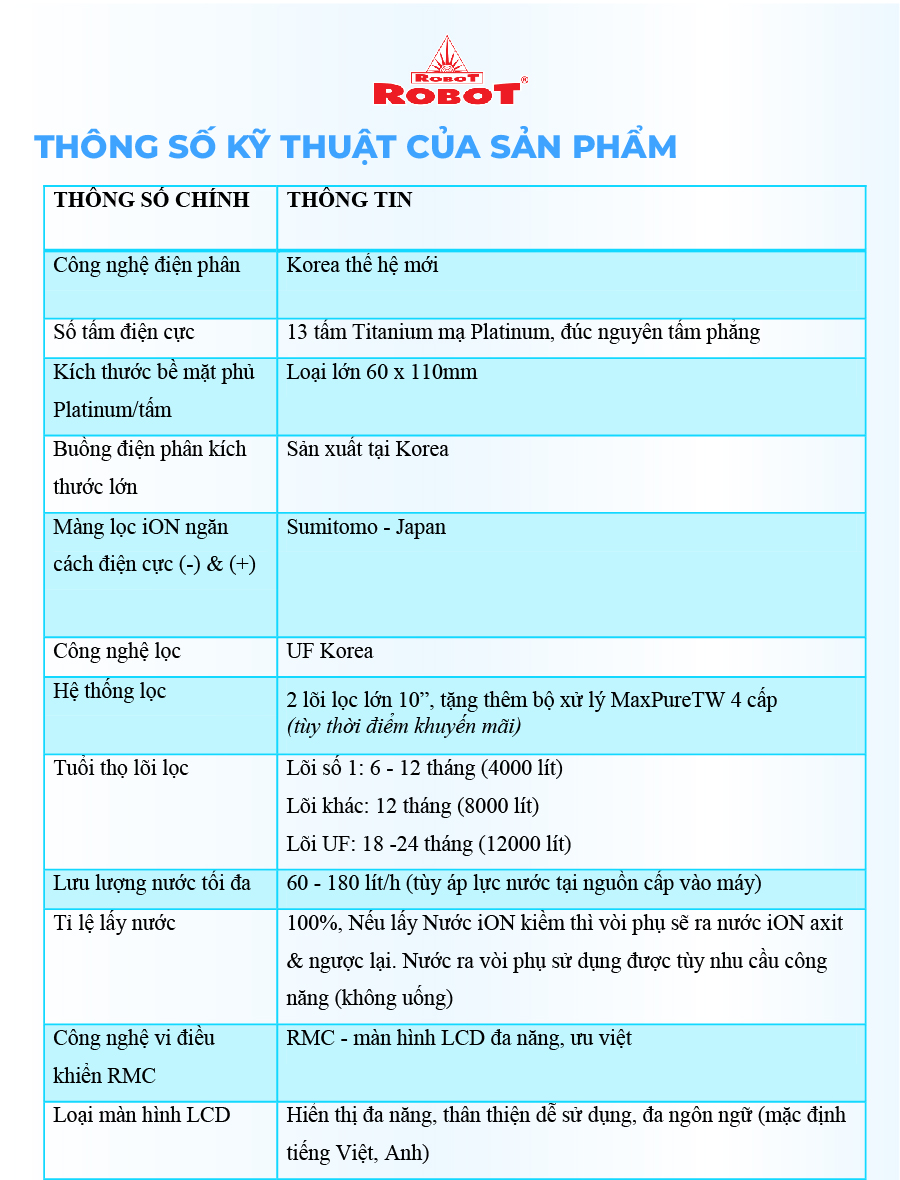 - ️ Với mong muốn nhiều gia đình Việt có thể sử dụng nước điện giải iON kiềm với chi phí hợp lý để bảo vệ sức khỏe, sắc đẹp & nâng cao chất lượng cuộc sống, ROBOT mang đến sản phẩm “Chất lượng Quốc tế - Giá thành Việt Nam”, phù hợp với mức sống của nhiều người. Tiết kiệm cho người tiêu dùng đến hơn một nửa chí phí so với máy nhập khẩu chỉ từ 30 – 50%, nhưng sở hữu nhiều ưu điểm, tính năng vượt trội, chất lượng cao.