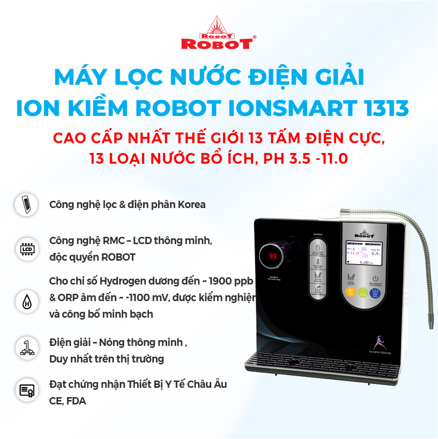 - ️ Máy lọc nước điện giải iON kiềm ROBOT ionSmart 1313 là sản phẩm được sản xuất với công nghệ tiên tiến, cao cấp nhất thế giới hiện nay, trang bị đến 13 tấm điện cực lớn nhất, có khả năng tạo ra đến 13 loại nước đa chức năng, với 6 mức nước iON kiềm (pH 8.5 và 11.0), nước lọc trung tính (pH 7.0) Nguội – Nóng & 5 mức nước iON axit (pH 3.5 - 5.5). Chất lượng nước đạt chỉ số tối ưu, nồng độ Hydro hoạt tính lên đến ~ 1600 -> 1900 ppb, chống oxy hóa (ORP) lên đến ~ -900 -> -1100 mV, đáp ứng mọi nhu cầu sử dụng trong cuộc sống.