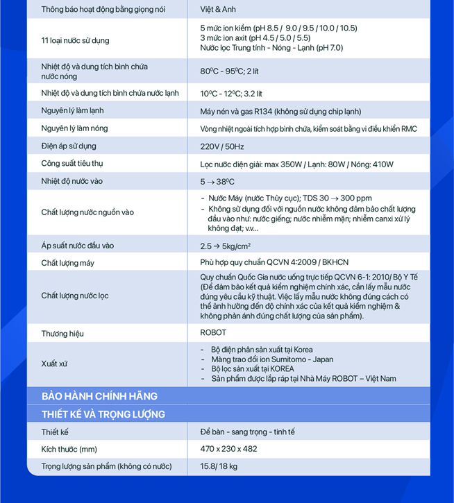 Chỉ số pH, Hydrogen, ORP: tùy thuộc chất lượng và số tấm điện cực của máy, đặc tính nguồn nước đầu vào & điều kiện đo - chỉ số công bố được đo ở điều kiện tối ưu.