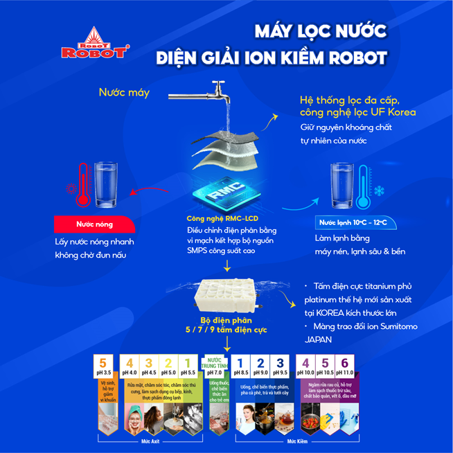 Công nghệ RMC-LCD, phát minh mới nhất của ROBOT tạo nên bước tiến mới trong ngành điện giải ion kiềm. Hoàn toàn không dùng hóa chất, chất xúc tác, lõi lọc bù khoáng để tăng/giảm độ pH, an toàn khi sử dụng, nhưng vẫn đảm bảo tạo đủ loại nước điện giải, có nồng độ Hydro hòa tan & độ chống oxy hóa ORP đạt tối ưu so với các dòng máy có cùng số lượng tấm điện cực.