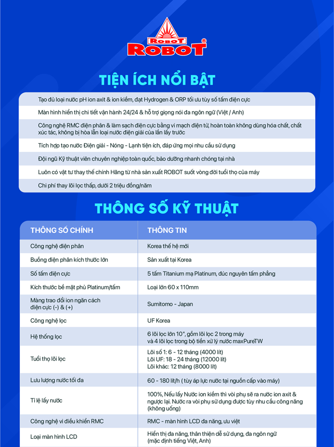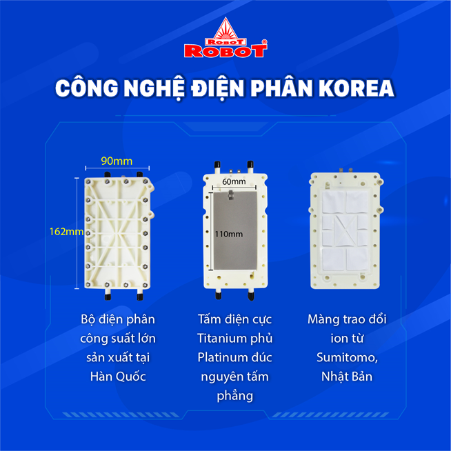 Máy lọc nước điện giải ion kiềm ROBOT tự hào là sản phẩm Thế Hệ Mới công nghệ tiên tiến Korea, hệ thống lọc cao cấp & các tấm điện cực bằng Titanium phủ Platinum dạng đúc nguyên tấm phẳng kích thước lớn sản xuất tại Korea.