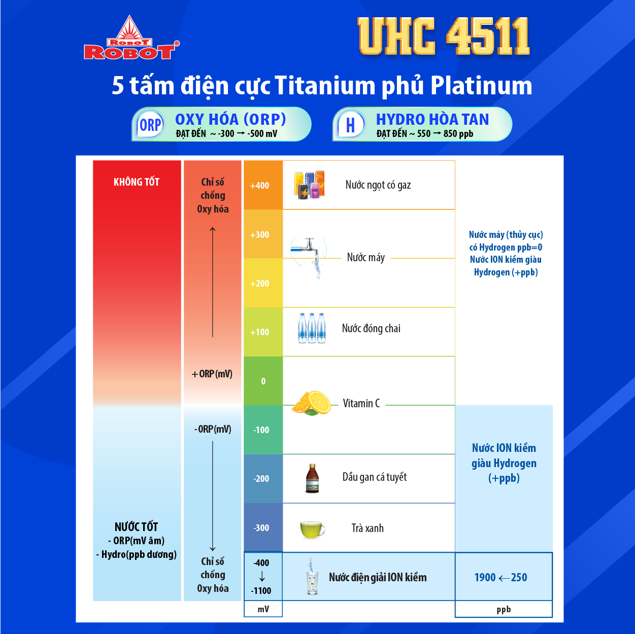 Máy lọc nước điện giải ion kiềm ROBOT UHC 4511 là model đặc biệt sản xuất với công nghệ tiên tiến trên thế giới, trang bị 5 tấm điện cực kích thước lớn, có khả năng tạo ra đến 11 loại nước đa chức năng, với 5 mức nước ion kiềm (pH 8.5 - 10.5), nước lọc trung tính - Nóng - Lạnh (pH 7.0) & 3 mức nước ion axit (pH 4.5 - 5.5), có thể điều chỉnh, thay đổi tùy theo đặc tính nguồn nước tại nơi lắp đặt. Với nồng độ Hydro hoạt tính lên đến ~ 550 -> 850 ppb, chống oxy hóa (ORP) lên đến ~ -300 -> -500 mV, đáp ứng nhiều nhu cầu sử dụng trong cuộc sống.