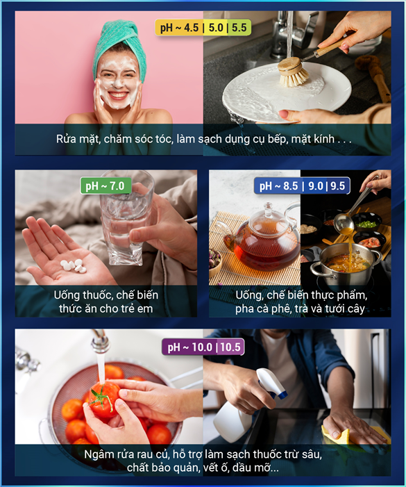 - Nước điện giải ion kiềm được tạo từ thiết bị điện phân ion hóa nước, tạo nhiều mức nước có pH, Hydrogen, ORP khác nhau với nhiều công năng sử dụng, không phải là thuốc và không có tác dụng thay thế thuốc chữa bệnh.