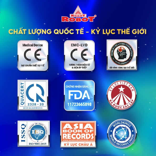 Máy lọc nước điện giải ion kiềm ROBOT đạt các chứng nhận cấp quốc tế, Thiết bị Y Tế & An Toàn Điện Châu Âu CE, đăng ký FDA, xác lập Kỷ Lục Việt Nam, Châu Á & Thế Giới, Đĩa Vàng Sáng Tạo Thế Giới, công bố bản quyền sáng chế Quốc Tế.