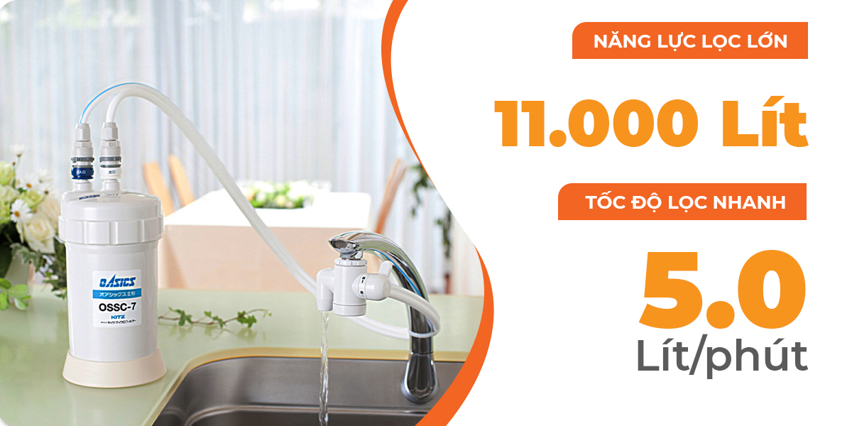 Nhờ ứng dụng công nghệ Màng lọc sợi rỗng nên OSS-T7 có tốc độ lọc nước nhanh 5.0 lít/phút phù hợp với nhu cầu sử dụng nước nhanh, tiện lợi, năng lực bộ lọc đến 11.000 lít giúp chi phí cho mỗi lít nước sạch rẻ hơn rất nhiều so với việc sử dụng nước đóng bình truyền thống.