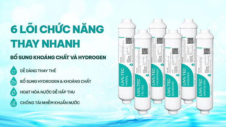 Livotec 630 sở hữu 6 lõi chức năng thay nhanh dễ dàng thay thế. Trong đó, điểm nhấn là lõi Hydrogen giúp bổ sung ion kiềm, chống oxy hóa; lõi Nano Silver chống tái nhiễm khuẩn nguồn nước đầu ra.