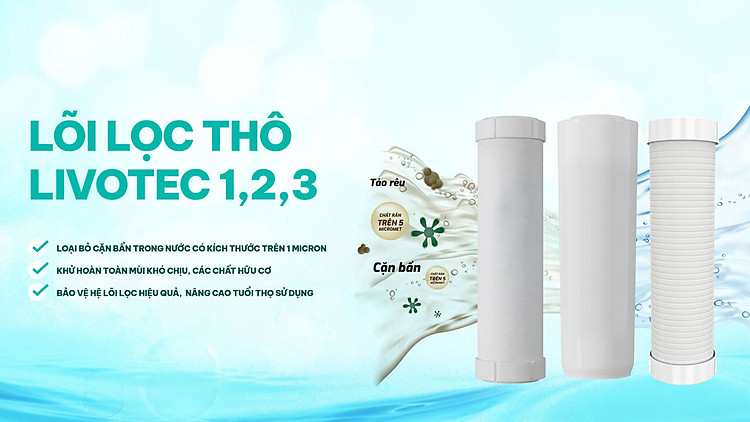 Hệ lõi lọc thô Livotec 1,2,3 loại bỏ cặn bẩn trong nước có kích thước trên 1 micron, khử hoàn toàn mùi khó chịu, các chất hữu cơ… bảo vệ hệ lõi lọc hiệu quả, nâng cao tuổi thọ sử dụng.