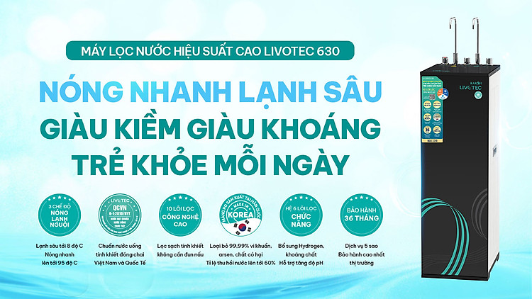 Sở hữu công nghệ làm lạnh Block và hệ lõi chức năng hiện đại, máy lọc nước hiệu suất cao Livotec 630 mang đến nguồn nước an toàn, giàu Hydrogen, ion kiềm và khoáng chất.