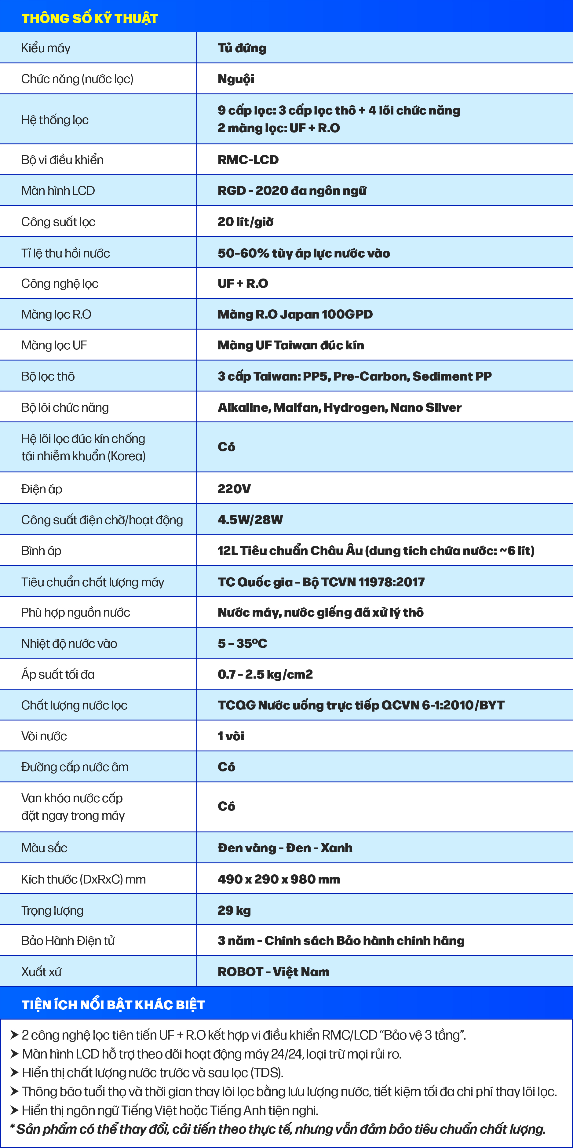 - Các sản phẩm máy lọc nước ROBOT đều sở hữu màn hình LCD sắc nét, hiển thị chi tiết các thông số TDS – chất lượng nước trước & sau lọc, tuổi thọ lõi lọc 24/24… để mọi người đều dễ dàng theo dõi hoạt động máy, chất lượng nước uống thông qua màn hình LCD, loại trừ mọi rủi ro, mang đến sự an toàn tuyệt đối khi sử dụng.