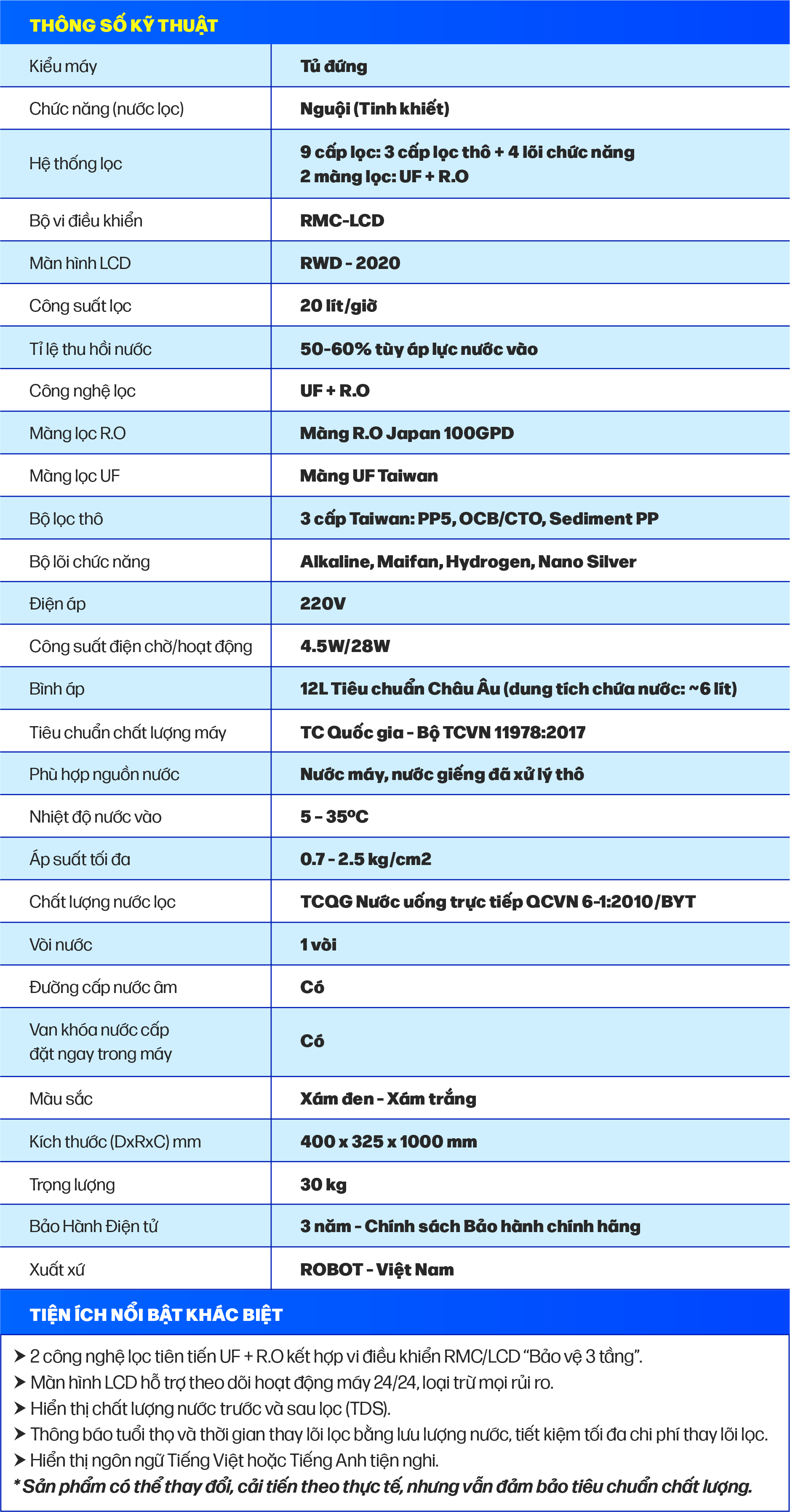 - Các sản phẩm máy lọc nước ROBOT đều sở hữu màn hình LCD sắc nét, hiển thị chi tiết các thông số TDS – chất lượng nước trước & sau lọc, tuổi thọ lõi lọc 24/24… để mọi người đều dễ dàng theo dõi hoạt động máy, chất lượng nước uống thông qua màn hình LCD, loại trừ mọi rủi ro, mang đến sự an toàn tuyệt đối khi sử dụng.
