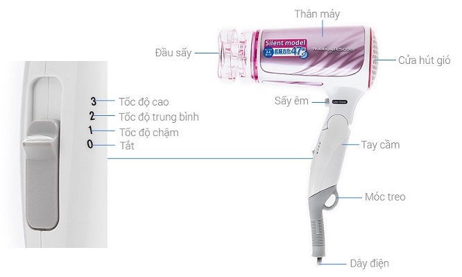 | Công dụng | : NTID721 có đến 03 lỗ phun ion, ion âm theo luồng gió thổi ổn định 1300W thẩm thấu đến từng nang tóc. Đặc biệt có chế độ sấy giảm ồn xuống 47dB ngay lập tức. |