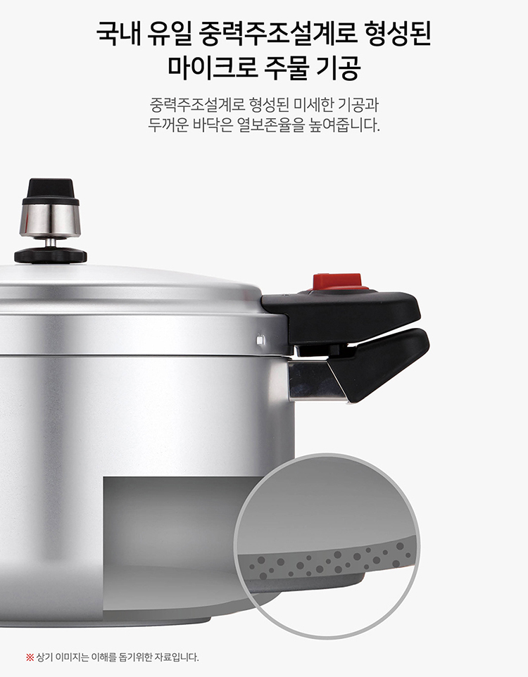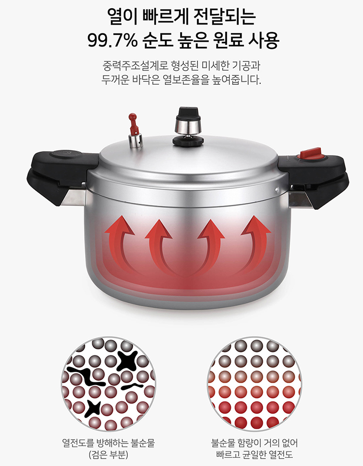 Toàn bộ cấu trúc nhôm tinh khiết nguyên khối cao cấp dầy 5mm với kỹ thuật đúc nguyên khối thủ công “Gravity Casting” cực kỳ bền và không bong tróc, nồi áp suất nhôm chống dính đúc nguyên khối POONGNYUN HCAPC-30 tối đa hóa hiệu suất dẫn và giữ nhiệt làm thức ăn chín đều cực nhanh mà thức ăn không bị cháy khét, tiết kiệm thời gian cũng như chi phí nhiên liệu nấu và giảm sự phá hủy chất dinh dưỡng trong quá trình nấu ăn một cách hiệu quả. Hơn thế nữa, với công nghệ nấu áp suất khoa học để tăng điểm sôi của nước lên 120ºC và chịu được sự gia nhiệt lên đến 400ºC làm thức ăn chín mềm nhanh hơn so với khi nấu bằng nồi áp suất điện.