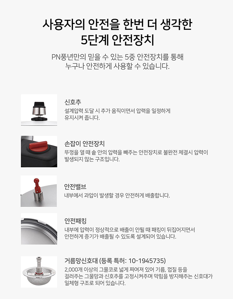 Nồi áp suất nhôm chống dính đúc nguyên khối POONGNYUN HCAPC-30 với thiết kế 5 chế độ an toàn cho sản phẩm giúp bạn an tâm trong khi nấu : Khóa nắp an toàn (không tạo áp suất khi chưa đóng nắp đúng cách), Van an toàn (tự động xả hơi nếu áp suất trong nồi vượt mức cho phép do bị nghẹt bọt thức ăn ở lần nấu trước đó cũng như cảnh báo áp suất còn trong nồi hay không), Nút tín hiệu (cảnh báo áp suất còn trong nồi hay không), Nắp bảo vệ van an toàn và nút tín hiệu (ngăn không cho thức ăn làm nghẹt van), Ron (không tạo áp suất khi ron lắp không đúng cách).
