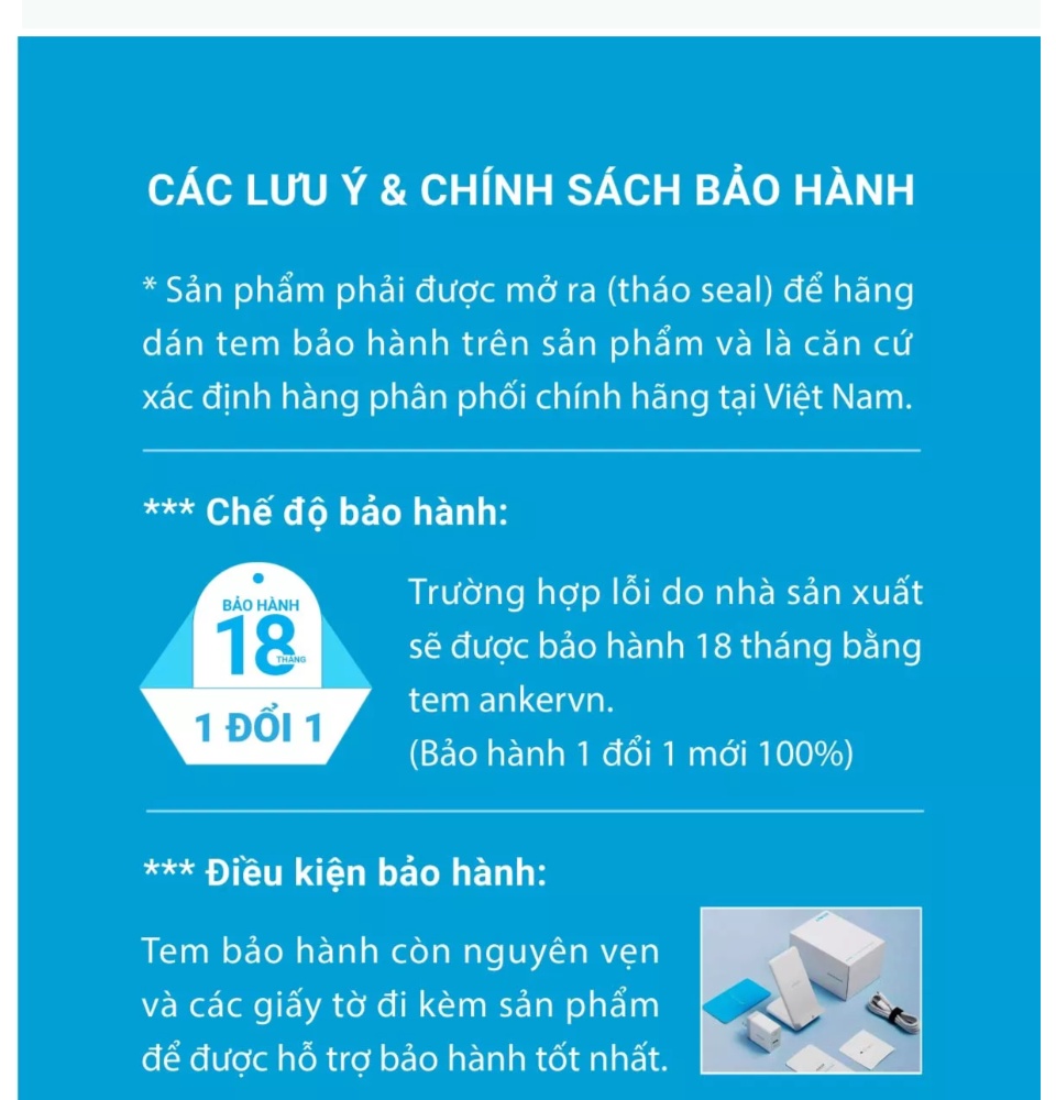 Chế độ bảo hành: Trường hợp lỗi do nhà sản xuất sẽ được bảo hành 18 tháng bằng tem ankervn. (Bảo hành 1 đổi 1 mới 100%).
