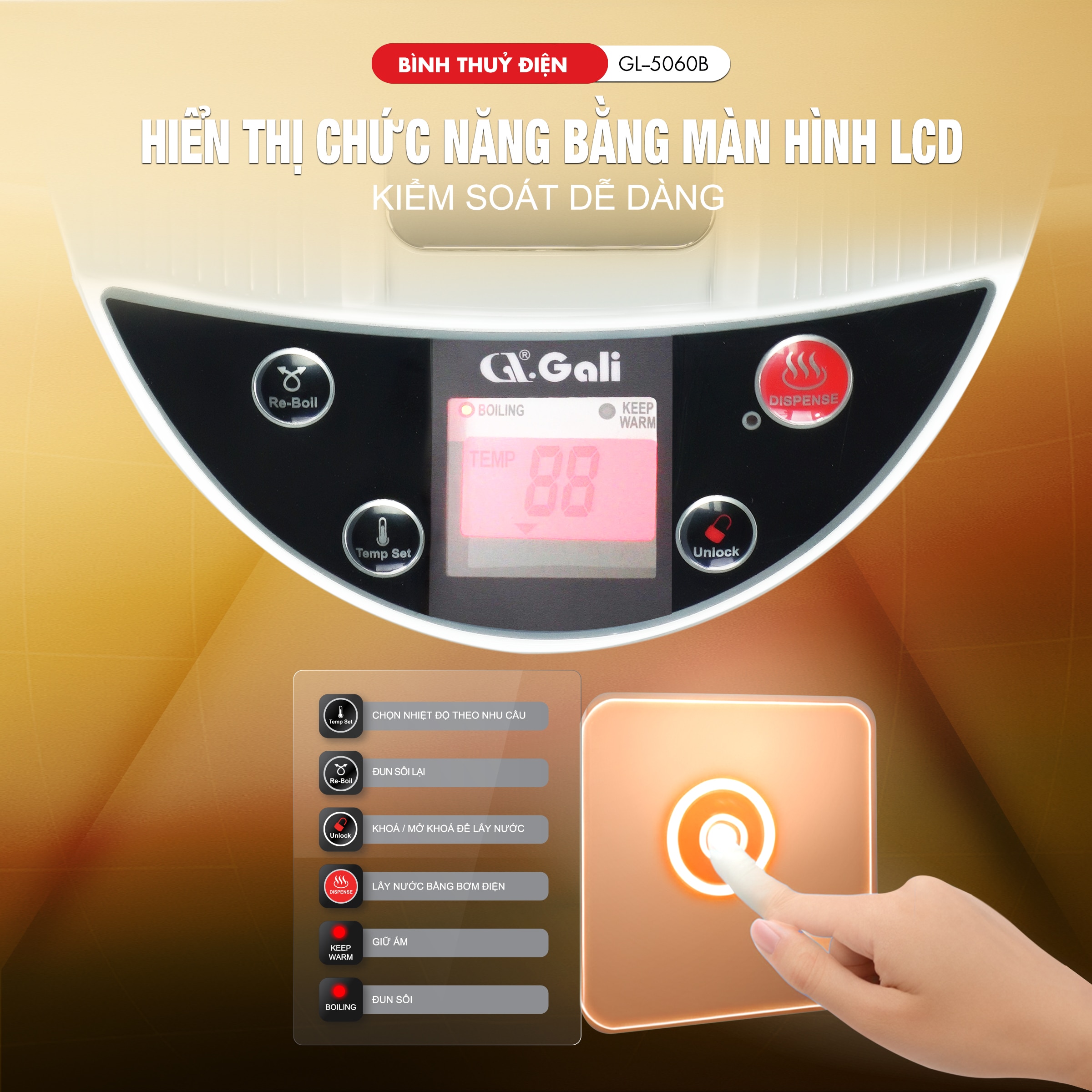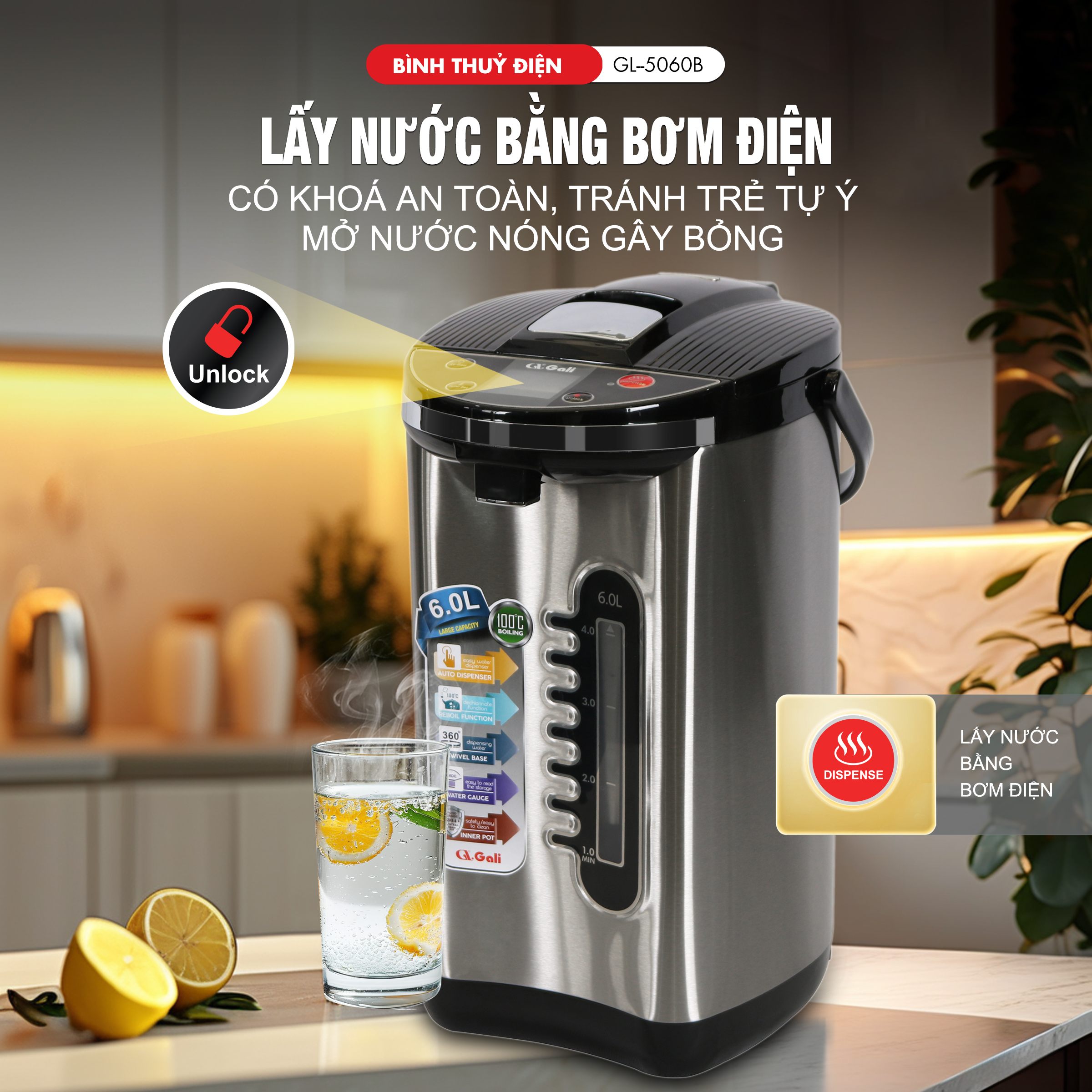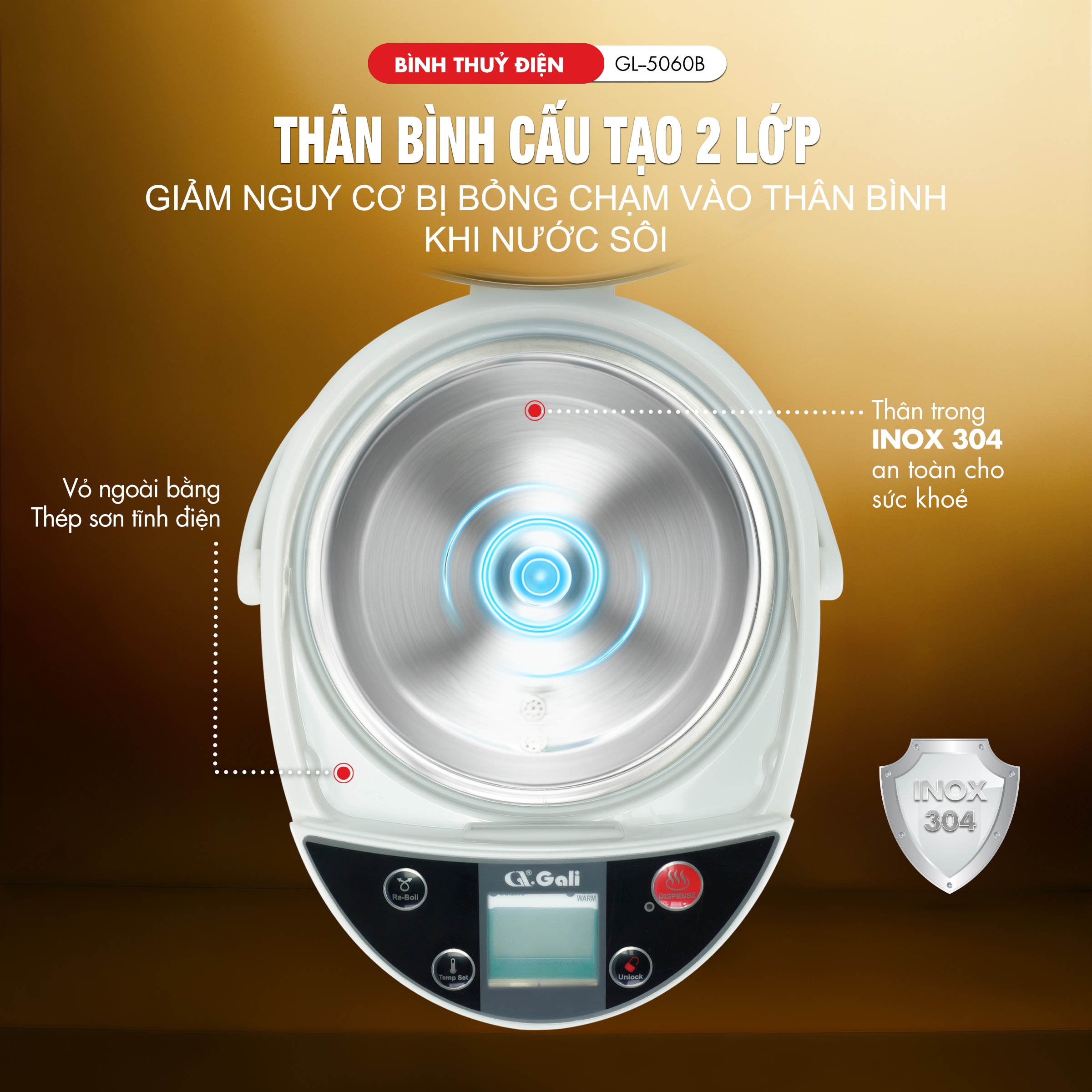 Bình Thuỷ Điện Gali GL-5060B Dung tích 6L nhỏ gọn, Thân bằng nhựa nguyên sinh cao cấp, lòng trong bằng Inox 304 dày chất lượng. Hàng chính hãng chất lượng cao bảo hành 24 tháng.