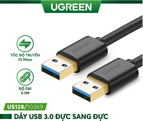 - Cáp USB 3.0 hai đầu đực dài 0.5M cao cấp Ugreen 10369 dùng để kết nối máy tính với ổ cứng, quạt tản nhiệt, bộ chia Hub USB hoặc cáp nối dài USB 3.0 và nhiều thiết bị khác, thuận tiện và nhanh chóng với tốc độ truyền tải dữ liêu lên đến 5Gbps.
