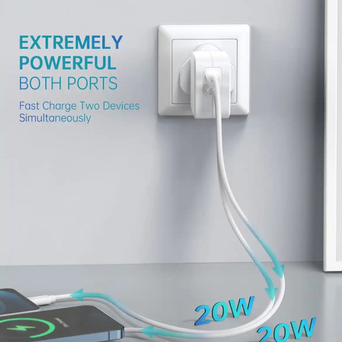 – Với tổng công suất đầu ra lên tới 40W, củ sạc nhanh 2 cổng Type C 40w Choetech PD6009 này sẽ nhận dạng thiết bị của bạn một cách thông minh và cung cấp dòng điện đầu ra nhanh nhất và hiệu quả nhất (20W cho mỗi cổng). Được trang bị đèn chỉ báo LED màu xanh lam, hai cổng USB-C sẽ sáng khi cắm vào ổ cắm điện, giúp bạn dễ dàng xác định vị trí bộ sạc tường trong bóng tối.