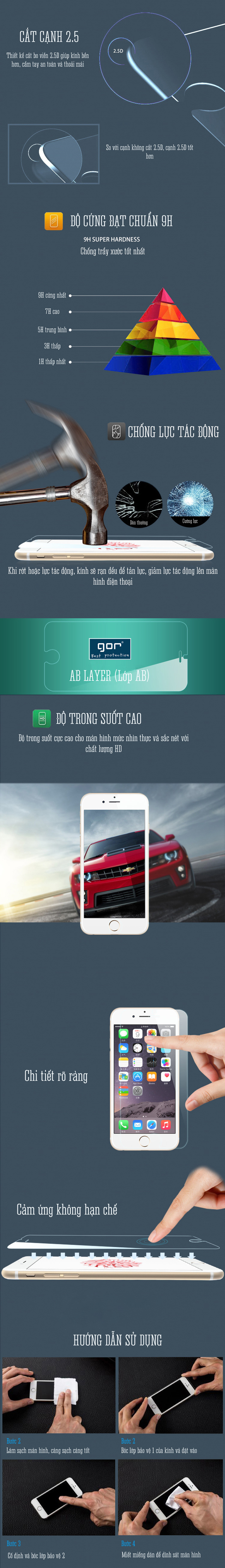 Sản phẩm cao cấp nhãn hiệu GOR với độ cứng đạt tiêu chuẩn 9H bảo vệ màn hình điện thoại khỏi bị trầy xước, vỡ hay giảm thiệt hại khi đổ nước.