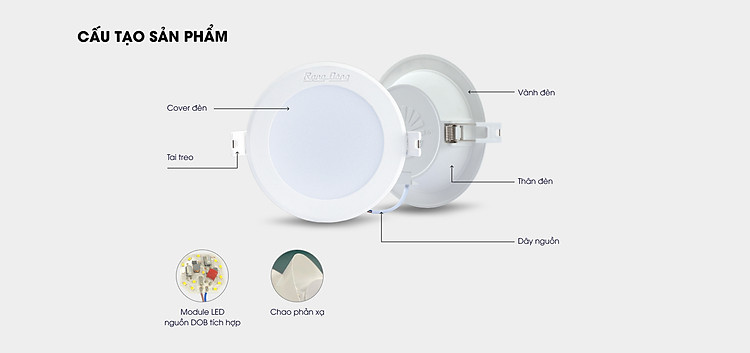 Đèn LED âm trần Downlight chính hãng Rạng Đông chất lượng ánh sáng cao, thân vỏ nhôm bọc nhựa liền khối, tản nhiệt tốt.