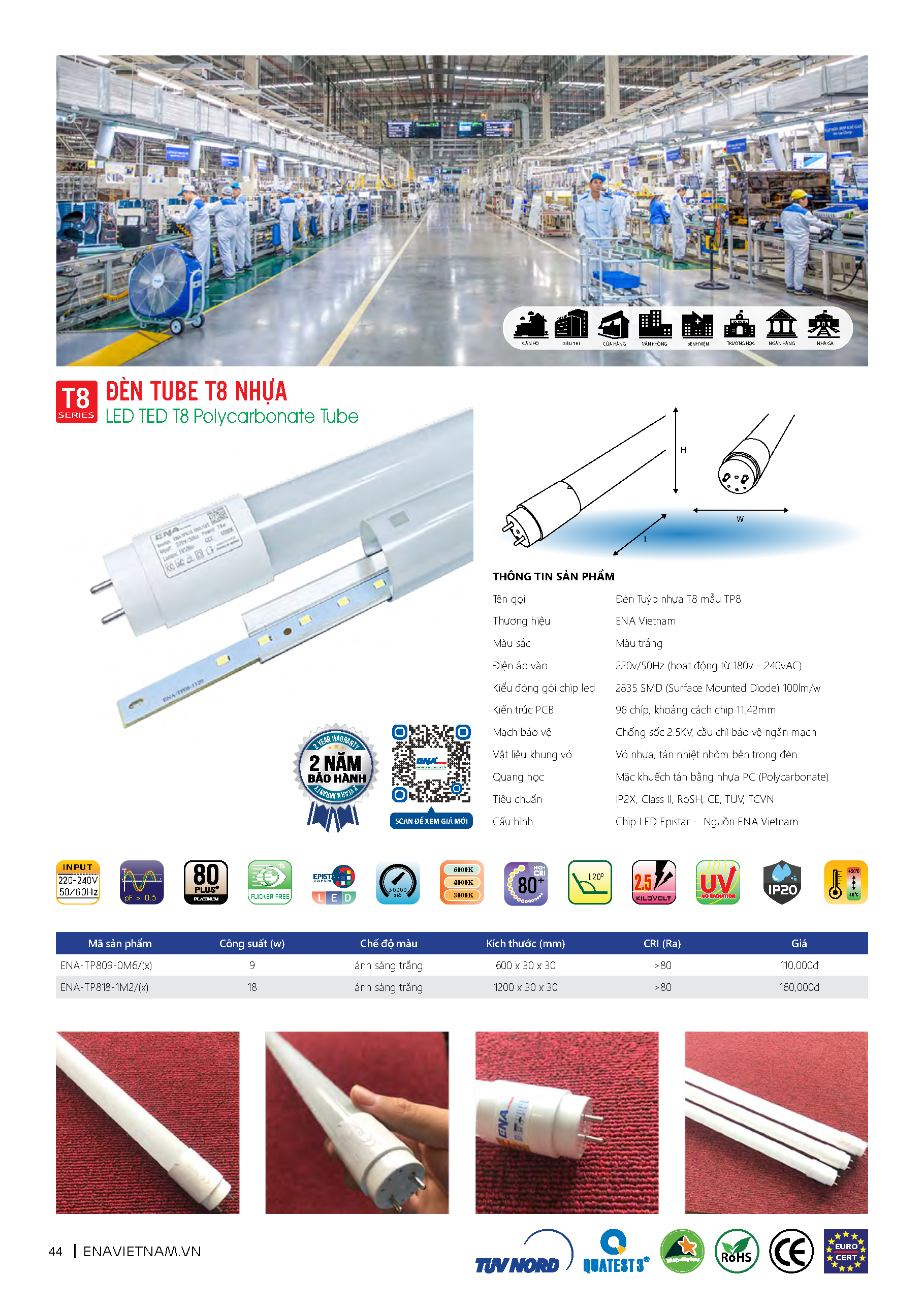 ĐÈN LED TUÝP T8 NHỰA SIÊU NHẸ MẪU TP8 - ENA Vietnam ánh sáng trắng: