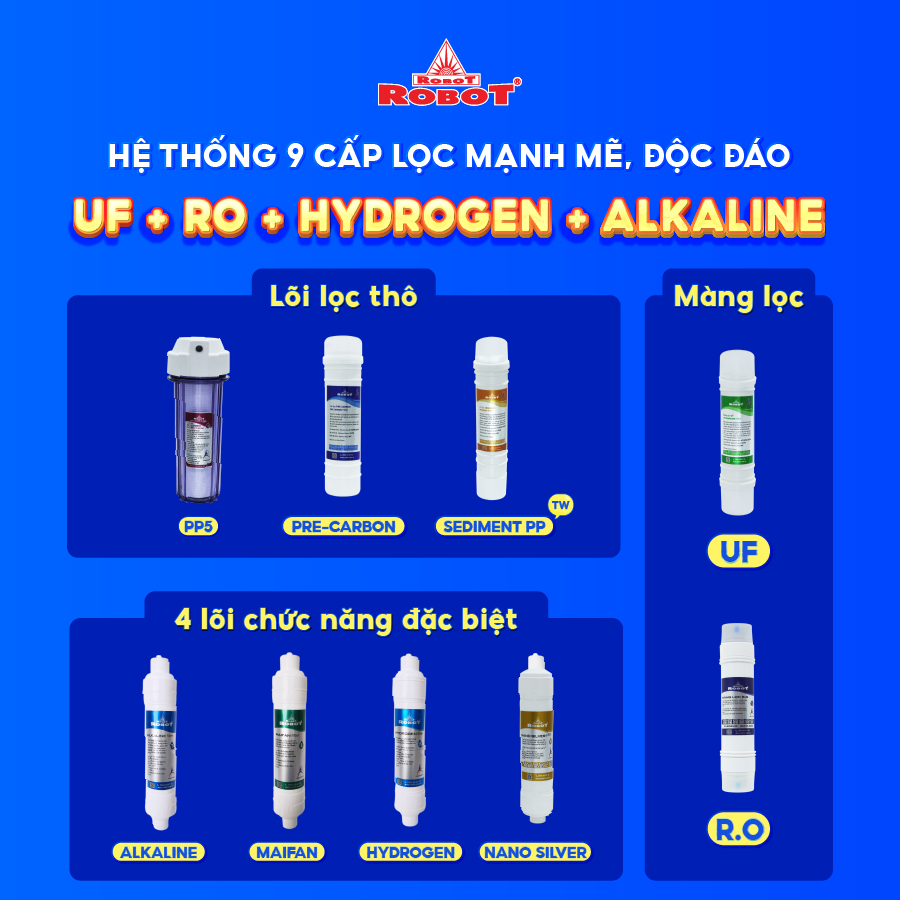 - Máy lọc nước ROBOT ALPHA PRO 9GK-UR thuộc dòng Máy lọc nước thế hệ mới của ROBOT, duy nhất trên thị trường sử dụng công nghệ “Bảo vệ 3 tầng” gồm 2 màng lọc UF + R.O & vi điều khiển RMC/LCD.
