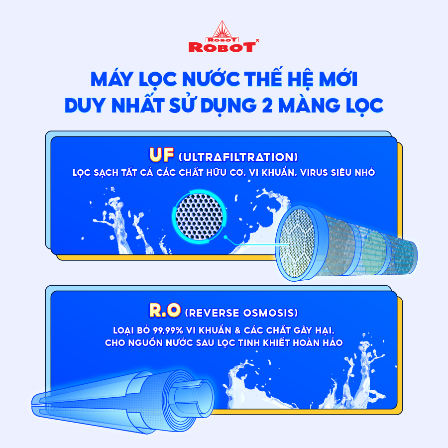 - Máy được tích hợp 2 công nghệ lọc tối ưu nhất hiện nay là UF (Ultrafiltration) & R.O (Reverse Osmosis) cho nguồn nước sau lọc sạch tối đa, được loại bỏ hoàn toàn cặn bẩn hay chất gây hại.