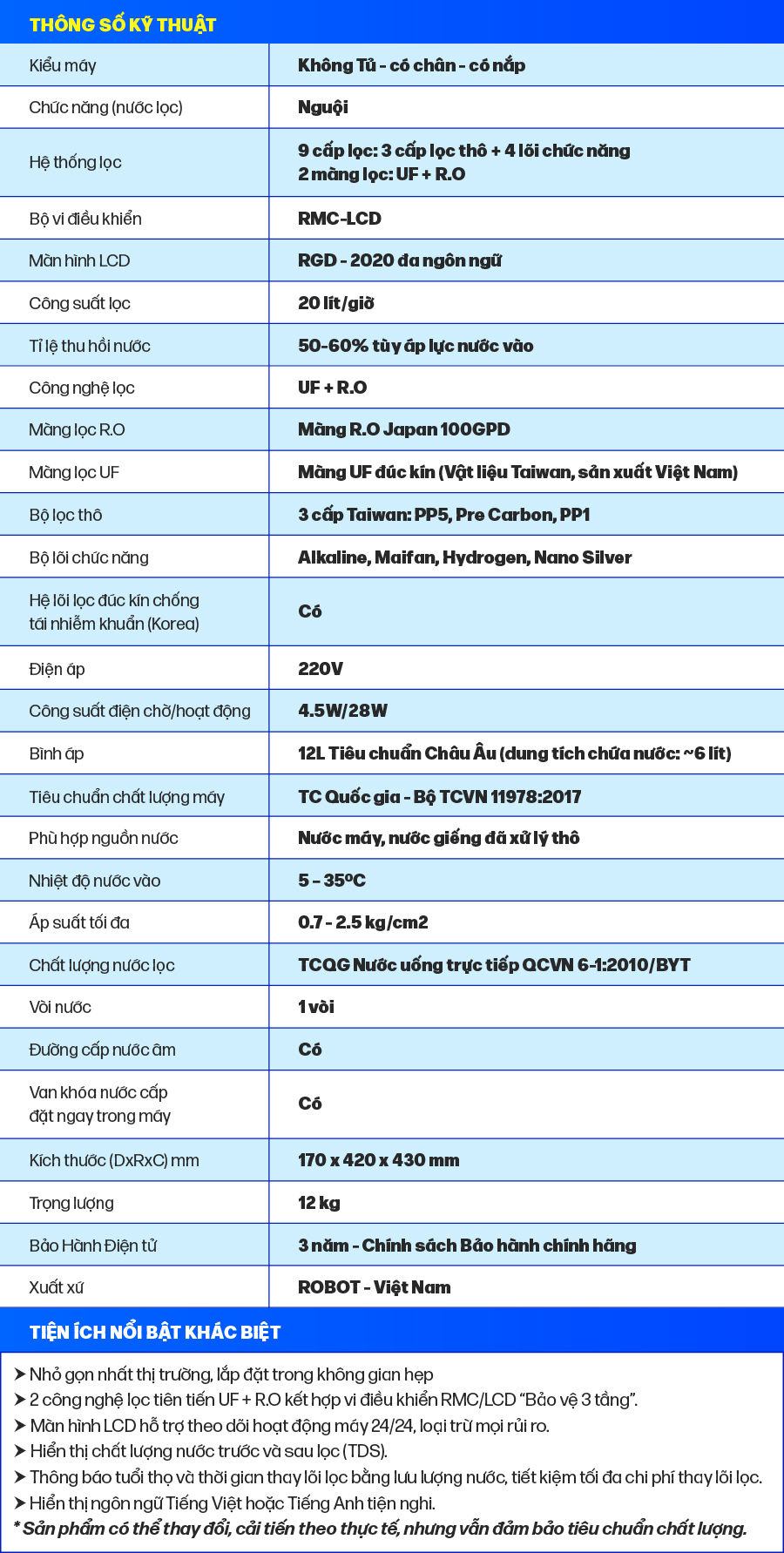 - Được trang bị thêm công nghệ vi điều khiển RMC-LCD thiết kế phát minh mới của ROBOT, hỗ trợ người dùng trực tiếp kiểm soát chất lượng nước trước & sau lọc, cảnh báo rủi ro trong quá trình sử dụng.