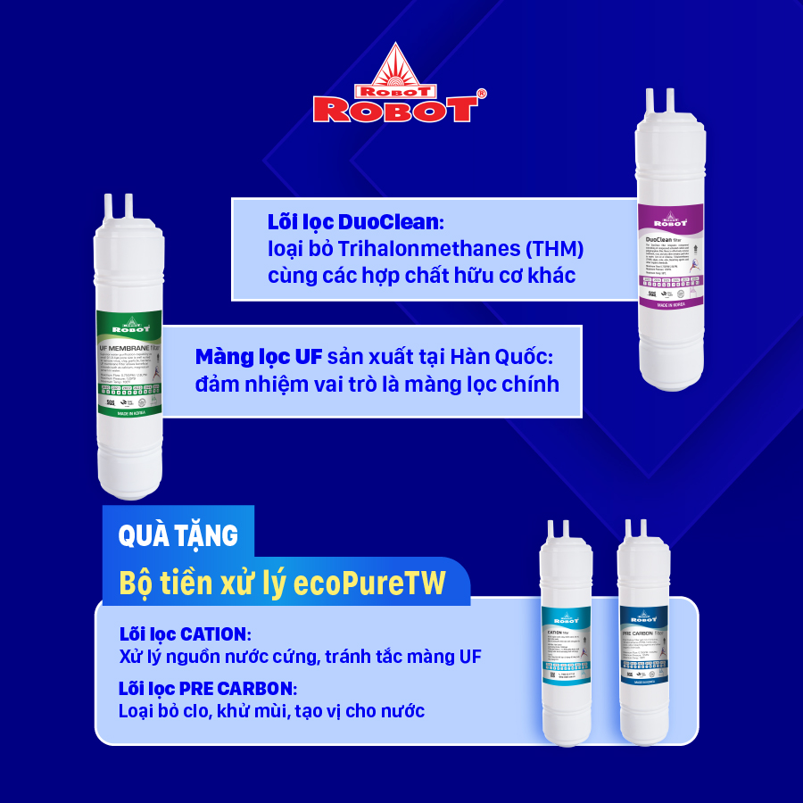 - Máy lọc nước điện giải ion kiềm ROBOT được thiết kế đảm bảo giá thành hợp lý dành cho người dùng, không chỉ tiết kiệm chi phí mua máy mà còn tối ưu chi phí sử dụng như thay lõi lọc, bảo hành.