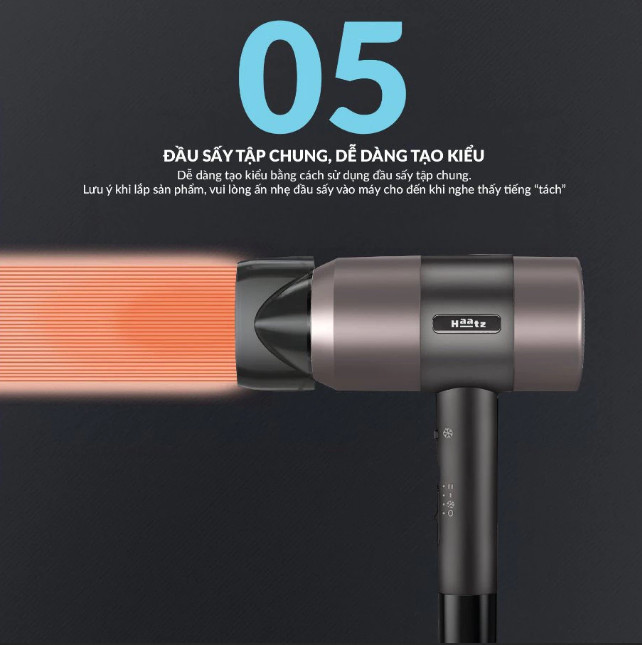 - Đầu sấy tập trung tạo luồng khí mạnh giúp tạo kiểu tóc dễ dàng