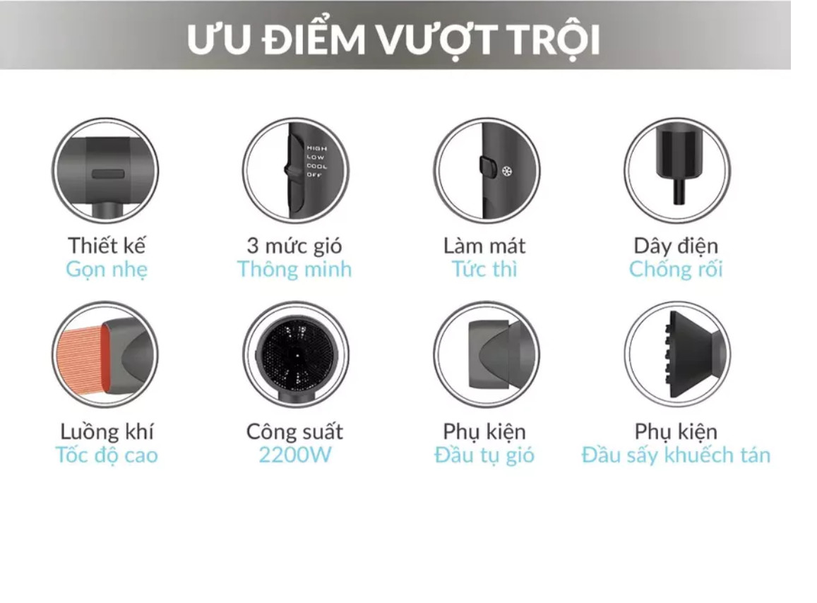 - Tạo luồng khí mạnh, giúp làm khô tóc nhanh trong vài phút