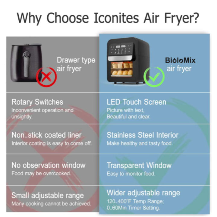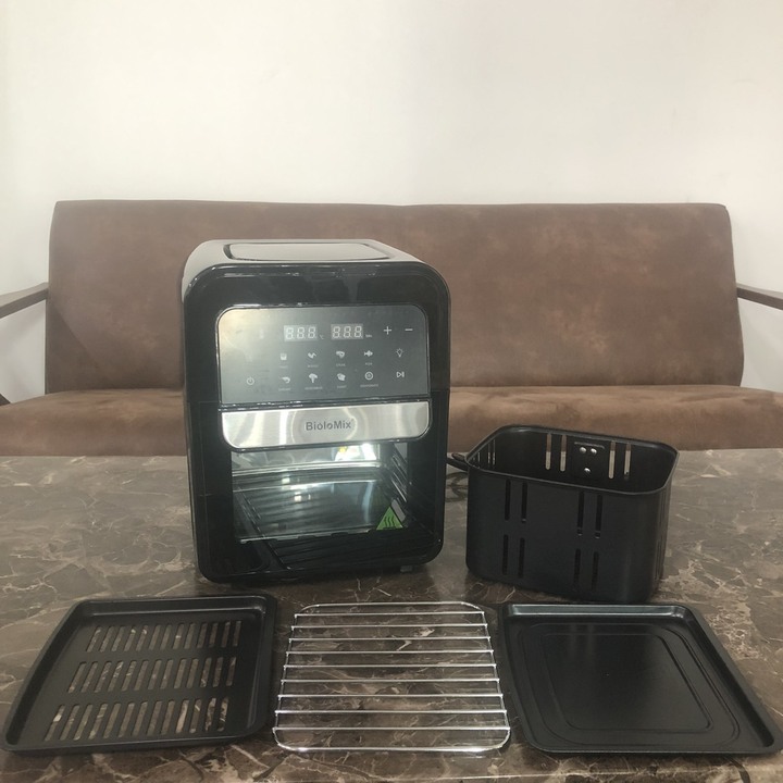 - Nồi chiên không khí Tất cả trong 1: Bạn có đang gặp rắc rối vì quá nhiều thứ bừa bộn trong nhà bếp? Đã đến lúc nói lời tạm biệt với nồi chiên nhúng nước, lò nướng bánh pizza, lò nướng bánh mì … Bất cứ điều gì họ có thể làm, lò nướng nồi chiên không khí BioloMix có thể làm tốt hơn! Thiết kế hai lớp độc đáo, tiết kiệm không gian và cho phép bạn chế biến nhiều loại thực phẩm cùng một lúc.