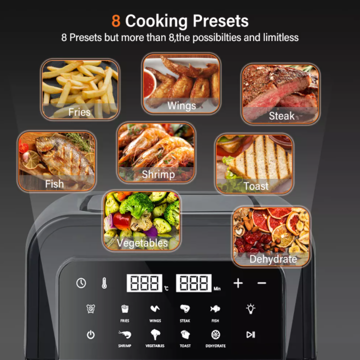 - Dễ sử dụng: Khoai tây chiên, cánh, bít tết, cá, tôm, rau, bánh mì nướng, khử nước …… Chỉ cần chạm và sử dụng! Màn hình cảm ứng tiên tiến linh hoạt cho phép bạn nấu các món ngon khác nhau một cách dễ dàng. Ngoài ra, máy sấy khô này còn được trang bị dải nhiệt độ rộng từ 50 đến 200 độ C và chế độ hẹn giờ nấu từ 0-60 phút.