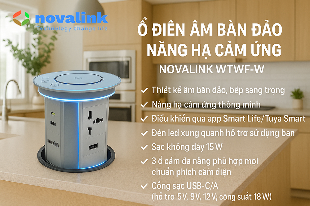 Ổ cắm điện âm bàn đảo nâng hạ cảm ứng Novalink WTWF-W - Giải pháp hiện đại cho không gian sống và làm việc