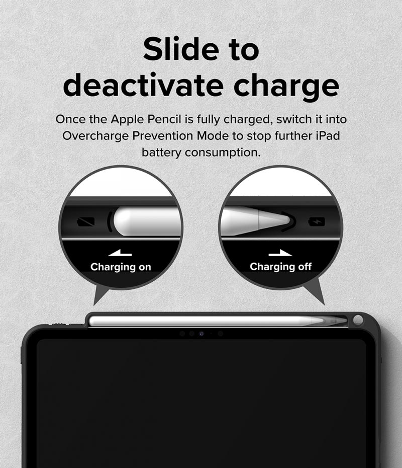 - Thiết kế thông mình có kèm ngăn đựng bút Pencil, chỉ cần trượt nhẹ để tắt tính năng sạc bút để tránh bị tiêu thụ quá mức pin của thiết bị.