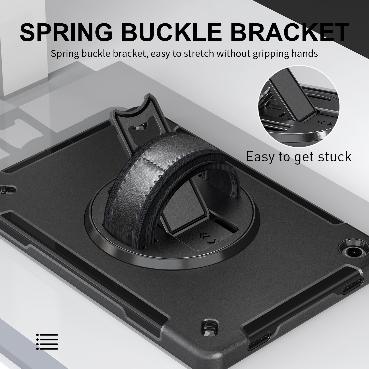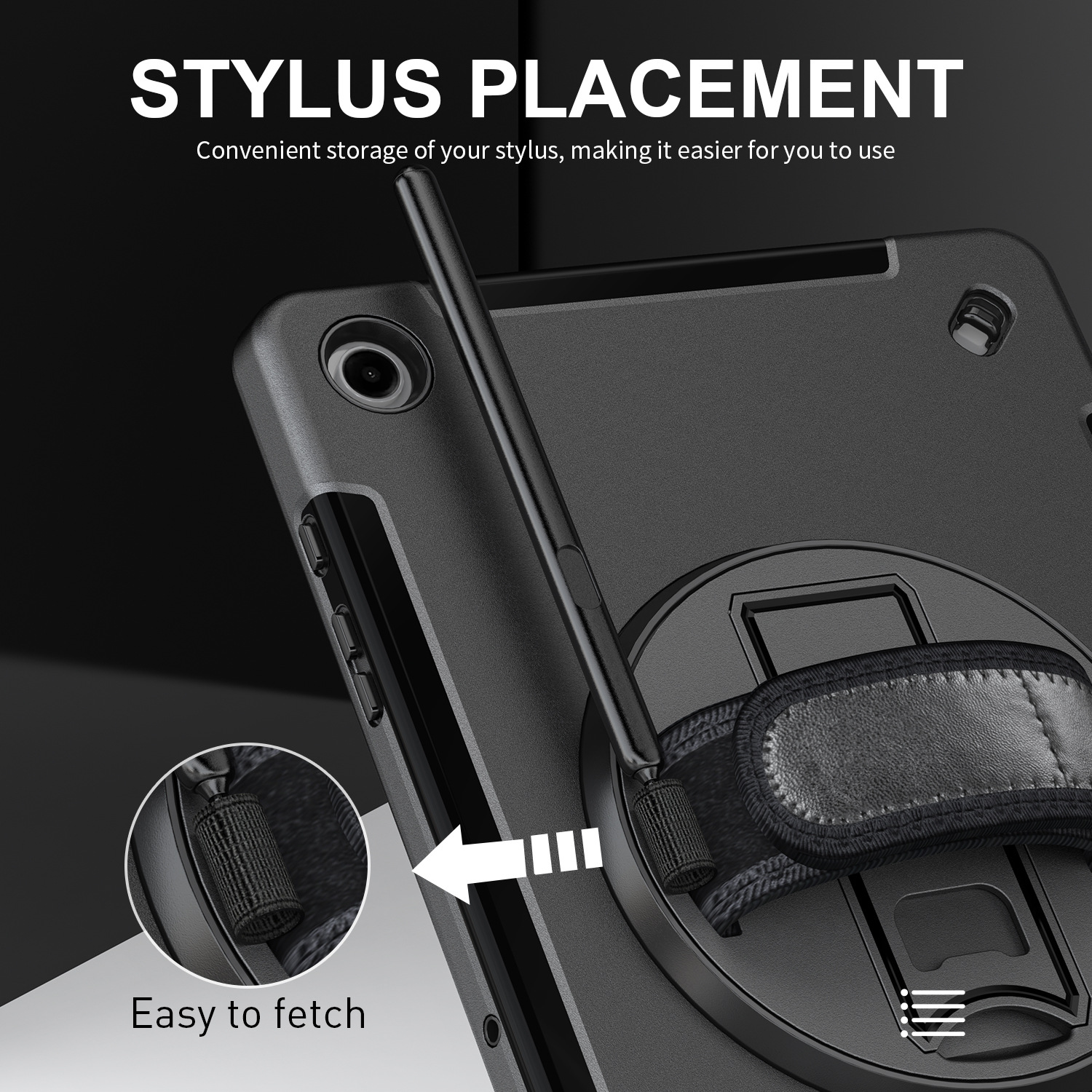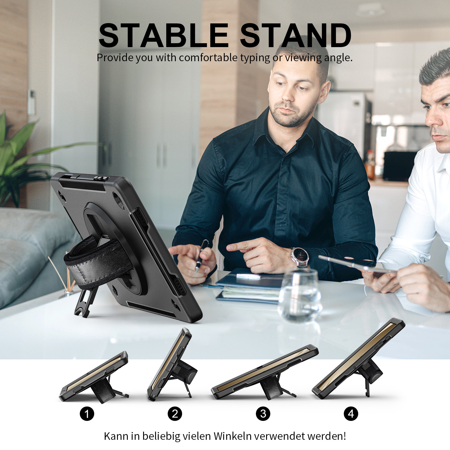 - Chân đế xoay 360 ° và dây đeo tay có thể điều chỉnh: Chân đế có thể gập lại xoay 360 ° cung cấp nhiều góc độ (30 ° / 45 ° / 60 °) để dễ dàng xem, nhập hoặc vẽ. Dây đeo cổ tay này có thể điều chỉnh và xoay để hiển thị bằng một tay