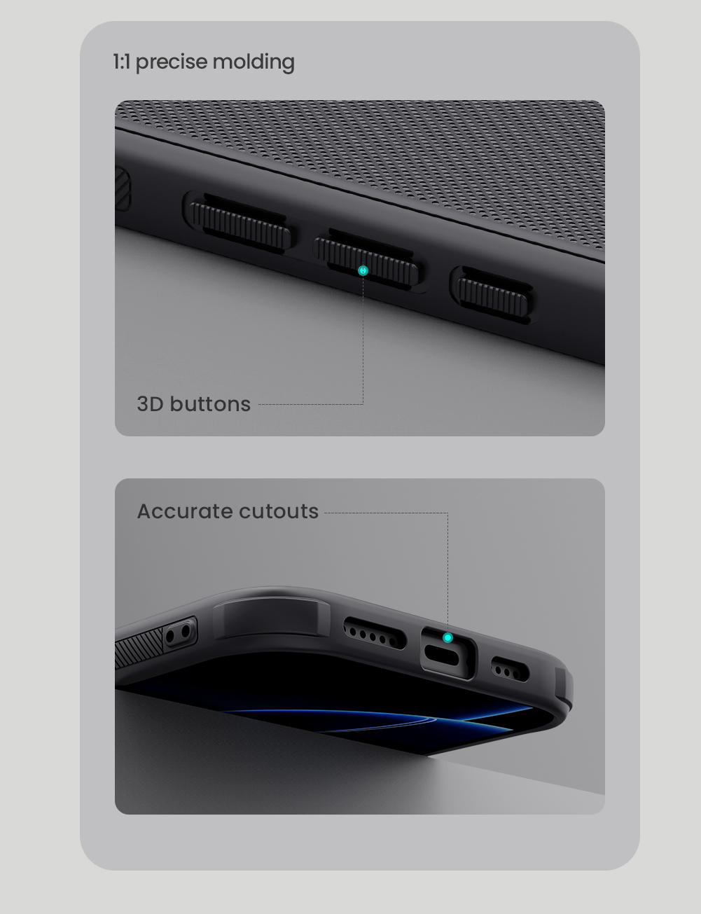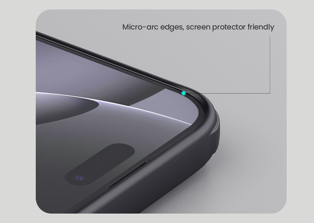 Super Frosted Shield Pro áp dụng công nghệ ép phun. Sử dụng vật liệu kép PC và TPU, nâng cấp khả năng bảo vệ. Tăng cường khả năng chống rơi với viền mềm TPU và cản ở bốn góc. Độ cứng của PC đủ tốt để không bị chuyển và dễ bị gãy. Được xử lý bằng công nghệ sơn UV mờ không bụi mới nhất, với cảm giác chạm thoải mái và vẻ ngoài thanh lịch. Bề mặt sử dụng thiết kế điểm nổi bật, chống mài mòn, chống trượt, chống bụi, chống dấu vân tay và dễ vệ sinh. Mở khuôn theo điện thoại di động thực tế với các lỗ chức năng chính xác.